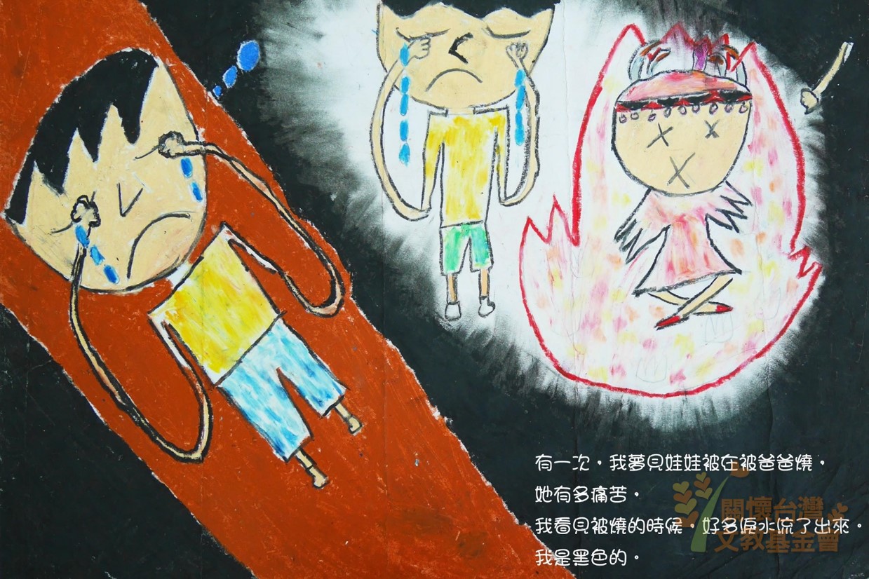 可是有一次、我沒有把娃娃藏好,結果娃娃就不見了。我回家時,我找不到娃娃,於是就問奶奶說:「我的娃娃呢?」奶奶就跟我說:「你的娃娃被爸爸拿走了。」我很緊張的問奶奶說:「爸爸把我的娃娃做什麼?」 奶奶又說:「爸爸爸把娃娃燒掉了。」 我好難過、好難過、好難過......我的世界是火紅色的。